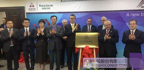 啟迪控股黨委書記李志強、常務副總裁陳鴻波、副總裁安紅平與埃及BUE大學副校長葉哈頁教授共同為啟迪北非中心揭牌