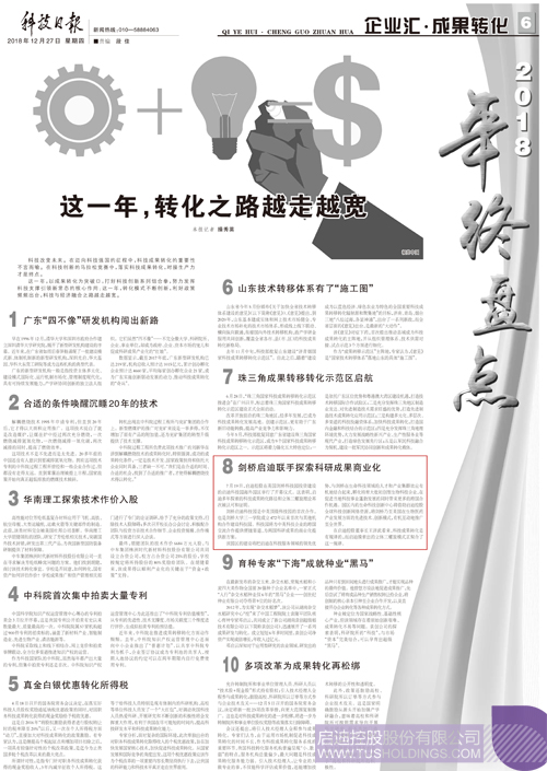 12月27日,科技日報刊文《這一年,轉(zhuǎn)化之路越走越寬》,文中提到:科技改變未來。在邁向科技強國的征程中,科技成果轉(zhuǎn)化的重要性不言而喻。在科技創(chuàng)新的馬拉松競賽中,落實科技成果轉(zhuǎn)化,對接生產(chǎn)力才是終點。這一年,以成果轉(zhuǎn)化為突破口,打好科技創(chuàng)新系列組合拳,努力發(fā)揮科技支撐引領(lǐng)新常態(tài)的核心作用;這一年,轉(zhuǎn)化模式不斷創(chuàng)新,利好政策頻頻出臺,科技與經(jīng)濟融合之路越走越寬。